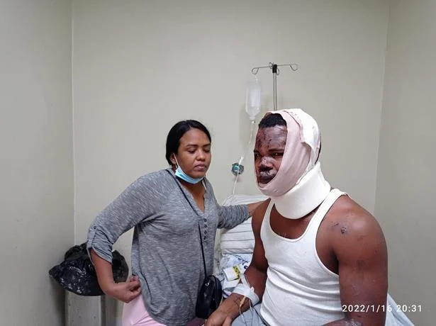 En la sala de emergencias del Hospital Regional Universitario Jaime Mota, el camionero dominicano Víctor Alfonso Alcántara Figuereo, es cuidado por su pareja mientras le tratan las heridas de bala, y por un accidente de tránsito que ambos sufrieron en Haití.