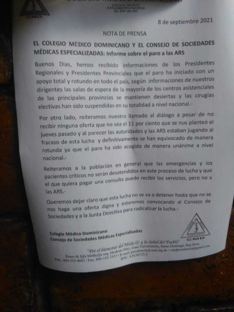 Santo Domingo. – El Colegio Médico Dominicano (CMD) y El Consejo De Sociedades Médicas Especializada, convocaron la mañana de este miércoles a un paro en todos los servicios de salud, dando inicio así con un apoyo rotundo y total en todo el país auspiciado por los presidentes provinciales y regionales que conforman el sector salud.